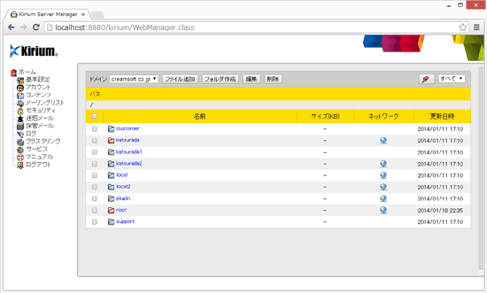 ドメイン creamsoft.co.jp http://www.creamsoft.co.jp/user1/mypublic/myoffice/mydocs.txt <data directory> +--htdocs +--creamsoft.co.jp +--user1 +--mypublic +--myoffice +--mydocs.txtユーザー user1 フォルダ1 mypublic フォルダ2 myoffice ファイル mydocs.txt